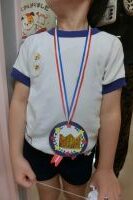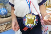 胸には大きな手づくりメダルと、お菓子が入った手さげ袋